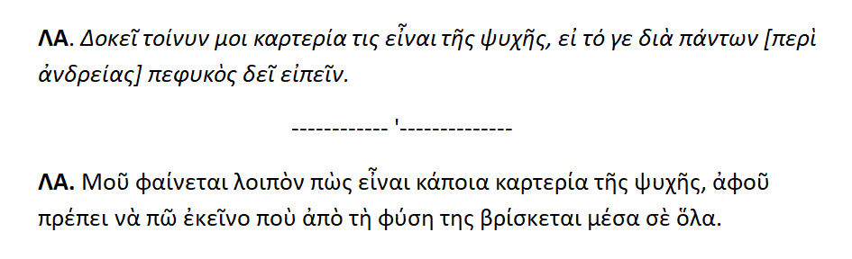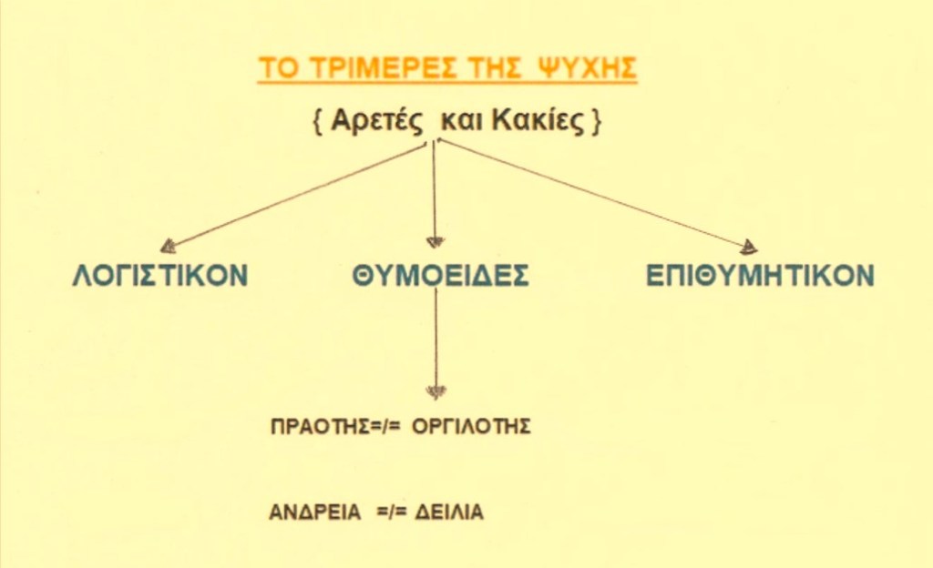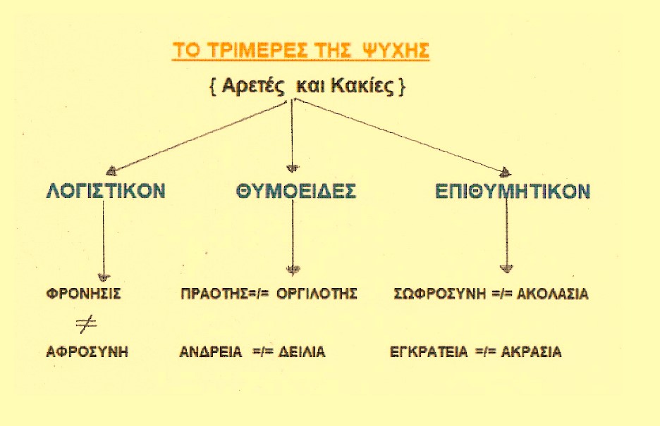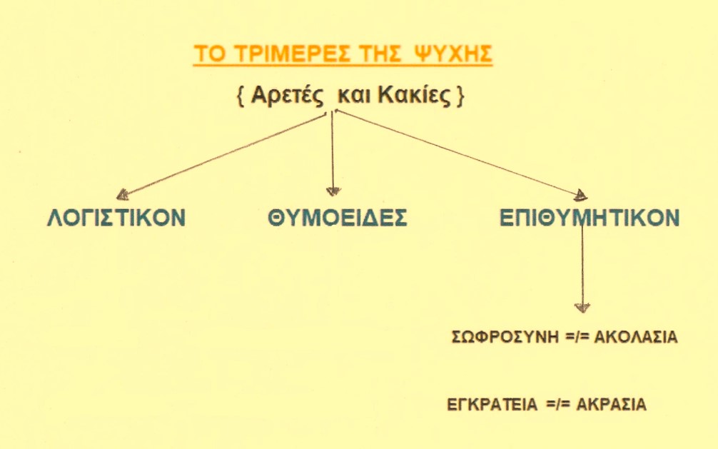 Όταν το Λογιστικόν μέρος της ψυχής επικρατεί του Αλόγου [ Θυμοειδούς και Επιθυμητικού } έχουμε καρτε-ρία και εγκράτεια .Όταν όμως επικρατεί το Άλογον μέρος,τότε έχουμε ακολασία και μαλακία [ μαλθακότητα ]. Η καρτερία και η εγκράτεια γίνεται με λύπη .