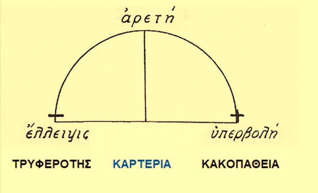 Καρτερία. Είναι αρετή του Επιθυμητικού μέρους της ψυχής. Συντάσσεται με την εγκράτεια. Ως αρετή είναι μεσότητα μεταξύ δύο κακιών ,της τρυφερότητας { έλλειψη } και της κακοπάθειας { υπερβολή }. Τρυφερός είναι αυτός που δεν μπορεί να υποφέρει κανέναν πόνο [ λύπη ] ,ούτε κι αν ήταν προς όφελός του , ο μαλθακός [ μαλάκας ]. Κακοπαθητικός είναι αυτός που υποφέρει όλους ανεξαιρέτως τους πόνους ,ο σκληρός ,ο ταλαίπωρος, ο γεννημένος να υποφέρει την εξαθλίωση και το κακό.