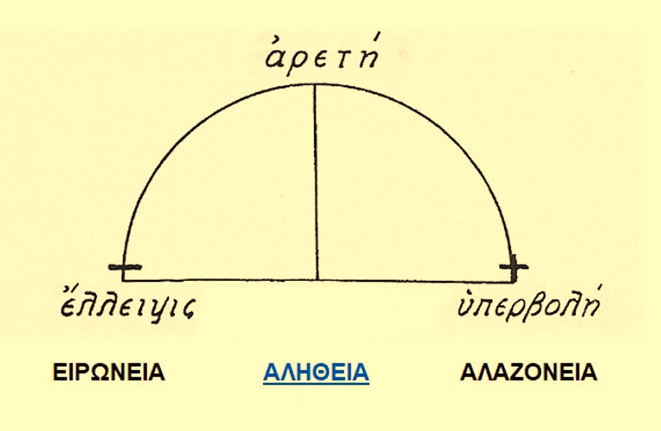 Η αλήθεια [ φιλαληθεία ] είναι μεσότης , μεταξύ δύο κακιών, της αλαζονείας [ υπερβολής ] και της ειρωνείας [ έλλειψη ]. Αλαζών [ υπερόπτης ] είναι εκείνος που παρουσιάζεται ,ότι έχει περισσότερα ,από όσα πραγματικά έχει. Είρων [ μεμψίμοιρος , μίζερος ] εκείνος που προσποιείται ,ότι έχει λιγότερα ,από όσα πραγματικά έχει.