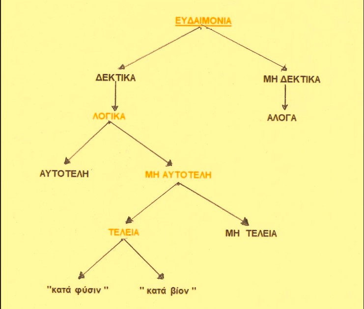 Ευδαιμονία : το αγαθόν ,που σύγκειται [ συναποτελείται ] από όλα τα αγαθά ‘ δύναμη ,η οποία αυτή καθ’ εαυτή επαρκεί [ αυτάρκης ] δια το ευ ζην [ ευζω’ί’α ] ‘ τελειότητα σύμφωνα με την αρετή ‘ αυτάρκης ωφέλεια ζώου.