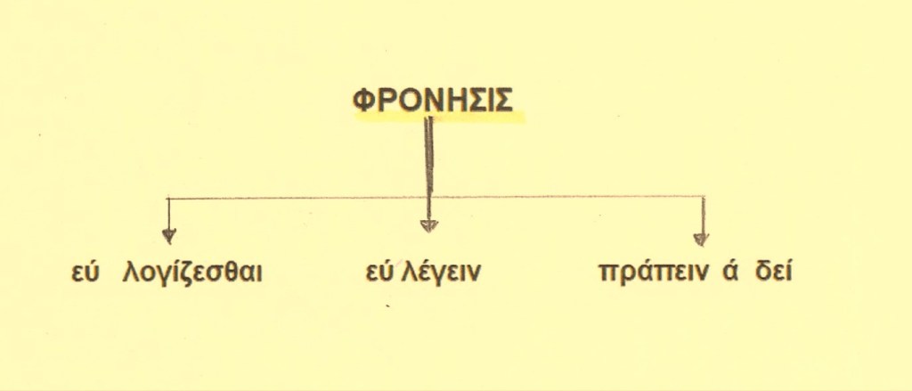 Φρόνηση ,1. δύναμη ,που ποιεί αφ’ εαυτής την ευδαιμονία του ανθρώπου 2. άριστη γνώση των αγαθών και των κακών 3. διάθεση της ψυχής κατά την οποίαν κρίνουμε του τί είναι ορθόν [ δέον ] να γίνει και τι δεν είναι.