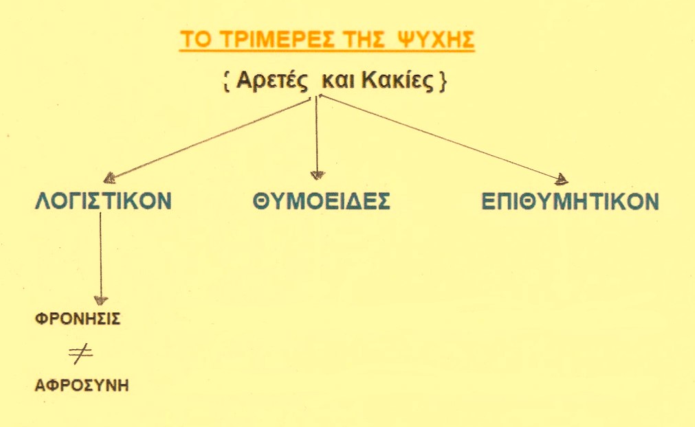 Φρόνησις ,είναι αρετή του Λoγιστικού μέρους της ψυχής, που προετοιμάζει τα πράγματα που συντείνουν [συντελούν ] στην ευδαιμονία. Αφροσύνη , είναι κακία [= ελάττωμα < έλασσον / έλαττον = μικρότερον, που υστερεί ] του Λογιστικού μέρους της ψυχής ,αιτία για να κάνει κανείς μια άθλια ζωή [ ζην κακώς ] .