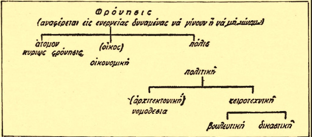 Η σοφία ασχολείται με το γενικό ,η φρόνηση με το καθ’ έκαστον. Η φρόνηση είναι η ίδια με την Πολιτική. Η Πολιτική διαιρείται σε δύο μέρη : α]. Αρχιτεκτονική πολιτική β]. Χειροτεχνική πολιτική.
