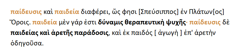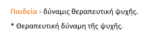 Διαφέρει η παιδεία από την εκπαίδευση : Παιδεία είναι δύναμη θερα-πευτική της ψυχής. Παίδευσις είναι παράδοση παιδείας [ σύστημα εκπαιδεύσεως ].Η παιδιά [ =παιχνίδι ] εξασκεί.