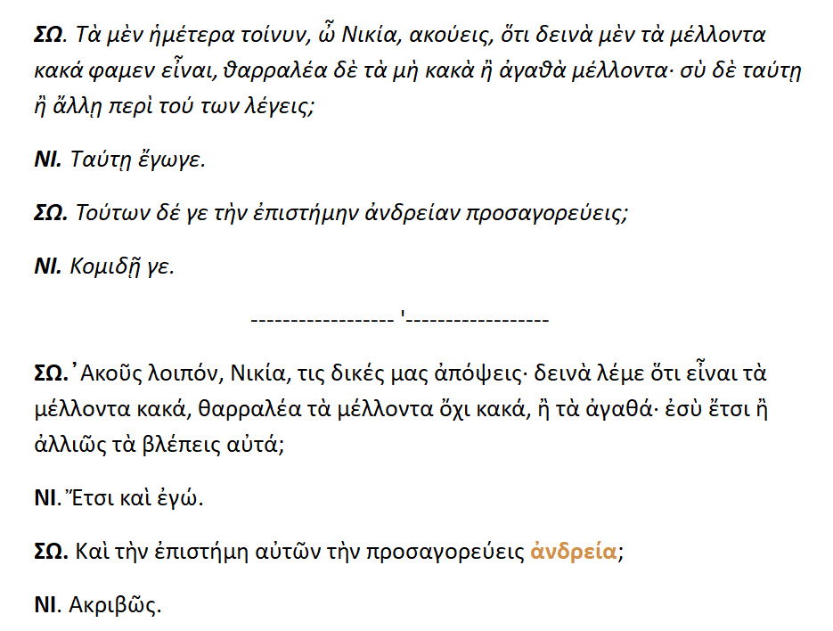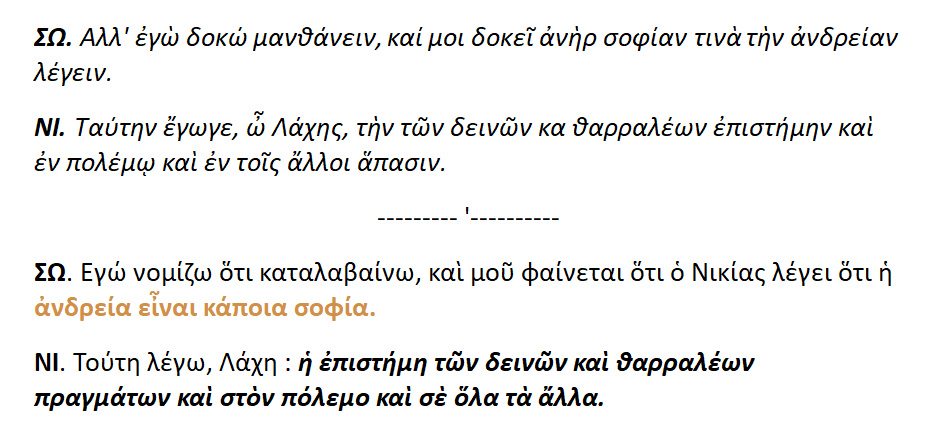 ΣΩΚΡ. : Κατά την γνώμη μου ,Πώλε, ισχυρίζομαι ,ότι ο καλός και αγαθός άνδρας και γυναίκα είναι ευδαίμων, ενώ ο άδικος και πονηρός είναι άθλιος.