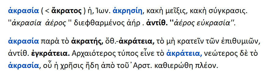 1.Ακρασία { < άκρατος < α στερ. + κεράννυμι } = κακή μείξη , κακή σύγκραση. 2.Ακρασία { < ακρατής < αστερ. + κράτος } = ακράτεια , το να μην επικρατείς των επιθυμιών.
