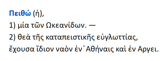 Πειθώ : α}.Ωκεανίδα β}. θεά της καταπειστικής ευγλωττίας.