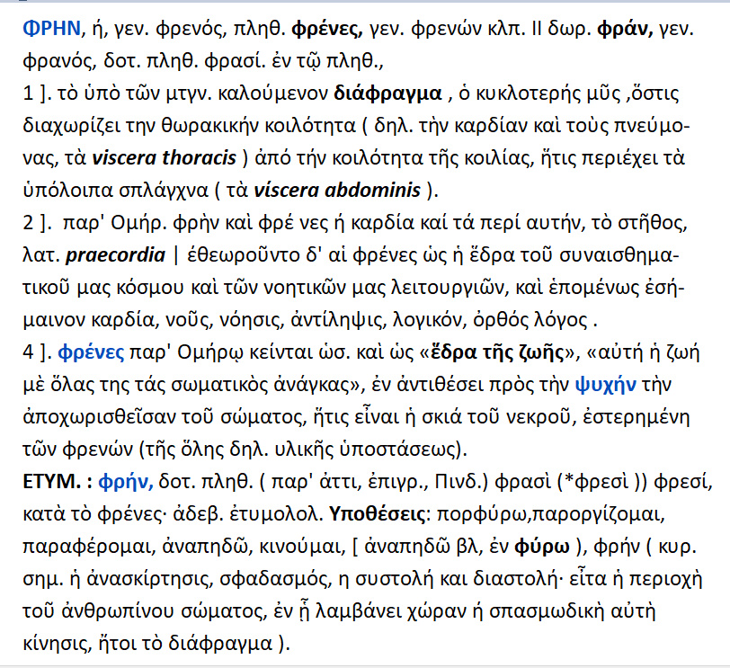 Φρην [ φραν ] – φρενός : το διάφραγμα ,που χωρίζει την θωρακική από την κοιλιακή κοιλότητα.