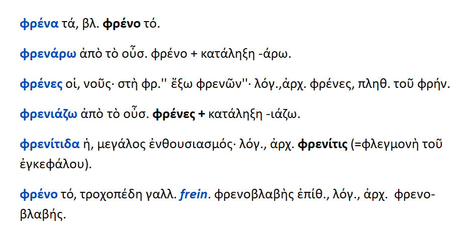 Φρόνησις { < φρην }. Φρενόω = βάλλω φρένες σε κάποιο. Αφροσύνη { α στερ. + φρην }.
