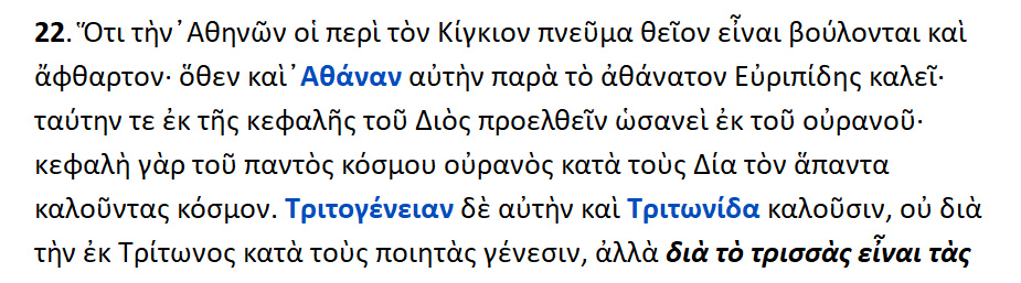 Η Θεά Αθηνά είναι Πνεύμα Θείον και Άφθαρτον , γι’ αυτό και ο Ευριπίδης την ονομάζει Αθάνα ,επειδή είναι η Αθάνατος του Θεού Νόησις ,που προήλθε από την κεφαλή του Διός σαν από τον ουρανό .Διότι κεφαλή όλου του κόσμου είναι ο ουρανός ,σύμφωνα με αυτούς που ονομάζουν ολόκληρο τον κόσμο Δία . Τριτογένεια δε και Τριτωνίδα ονομάζουν την Θεά Αθηνά ,όχι διά την γένεσιν εκ του Τρίτωνος ,σύμφωνα με τους ποιητές ,αλλά διότι οι ενέργειες της ψυχής είναι τρείς { σ.σ. ευ λογίζεσθαι , ευ λέγειν , πράττειν α δει }.