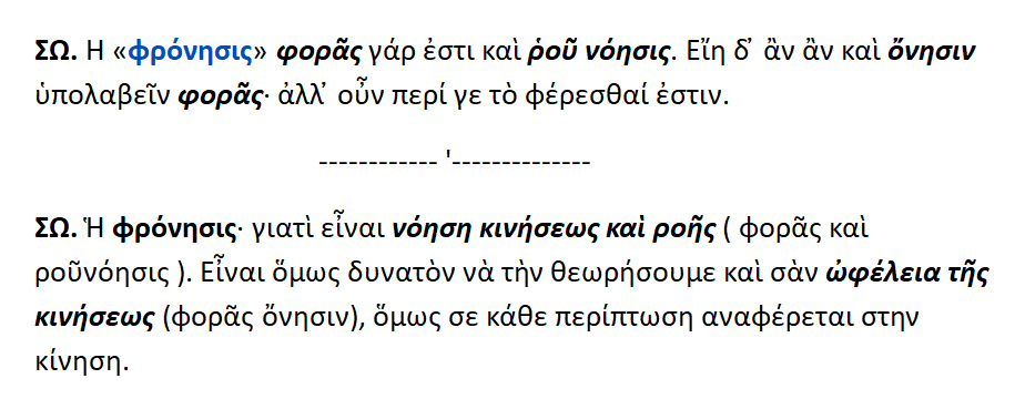 Φρόνησις : α]. φοράς και ρου νόησις [ = εννόηση της περιφοράς και της ροής ] β]. φοράς όνησις [ = η εκ της περιφοράς ωφέλεια ] .Σχετίζεται με την κίνηση.