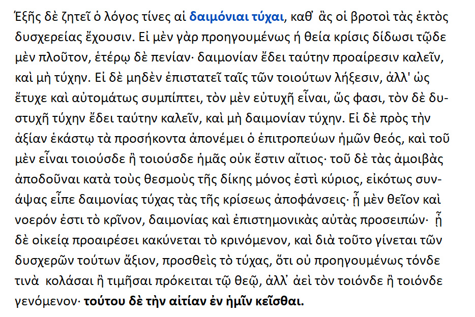 Διαφέρει η ευτυχία από την Ευδαιμονία .H ευτυχία ανήκει στα εξωτερικά αγαθά και είναι αποτέλεσμα της τύχης ,ενώ η Ευδαιμονία στα εσωτερικά αγαθά και έρχεται ύστερα από προσπάθεια. Κανείς δεν έγινε δίκαιος η σώφρων εξ αιτίας της τύχης.