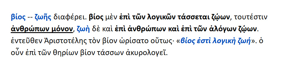 Ο βίος του ανθρώπου όντας τέλειος ,υστερεί μεν του Θεού, διότι δεν είναι α υ τ ο τ ε λ ή ς ,υπερέχει δε των αλόγων ζώων , διότι μετέχει της αρετής και της ευδαιμονίας .