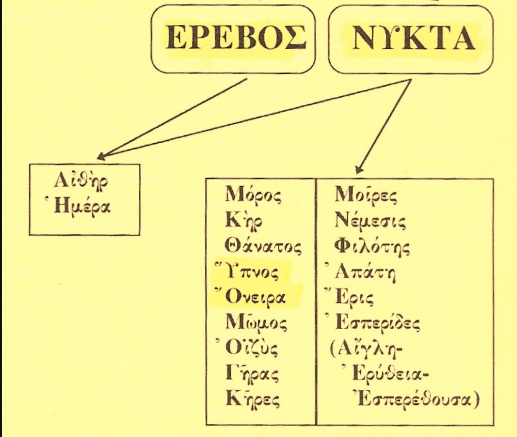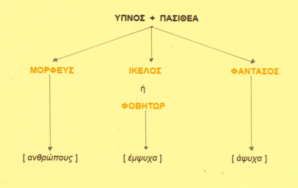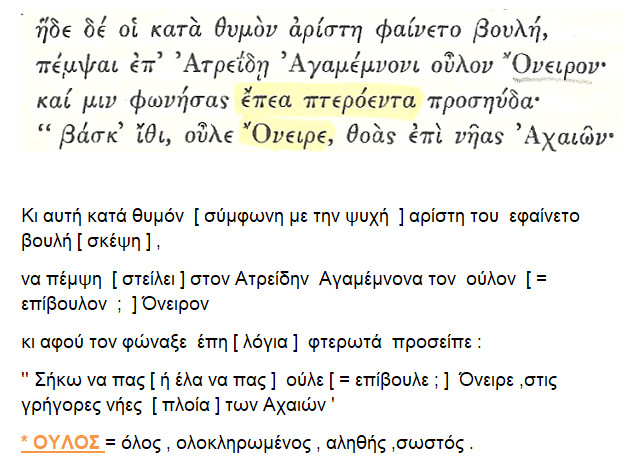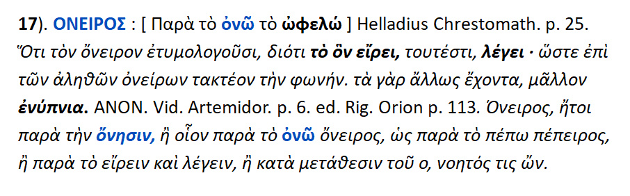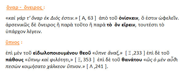 Όναρ : ή από το ονίσκειν [ = ωφελείν ] ή από το » το ον είρειν » [ = το υπάρχον λέγειν ] .Ύπνος : 1. ο ειδωλοποιημένος θεός 2. ο θάνατος.