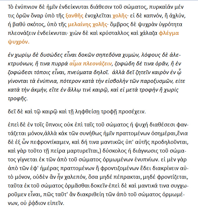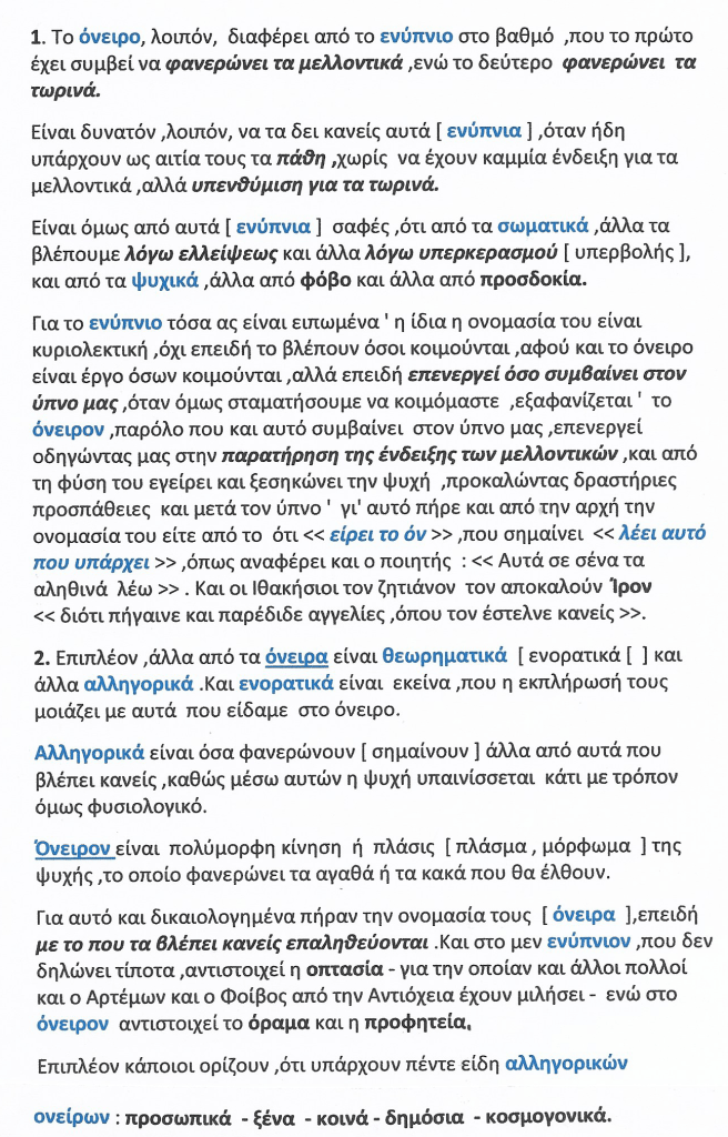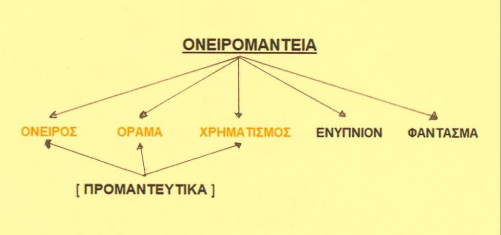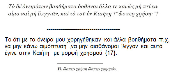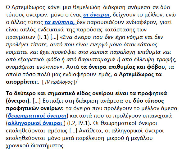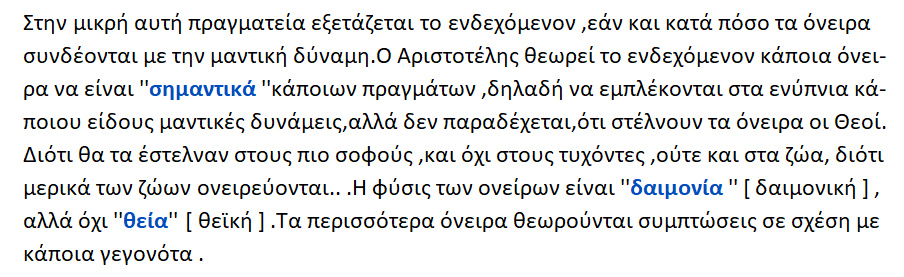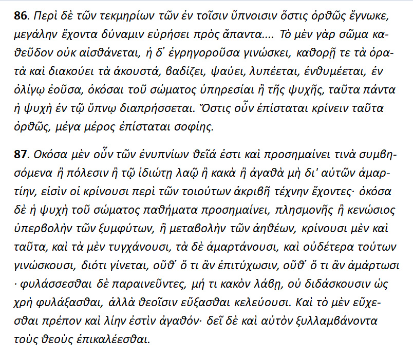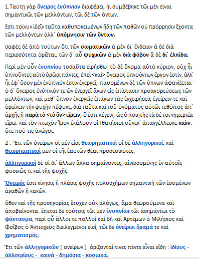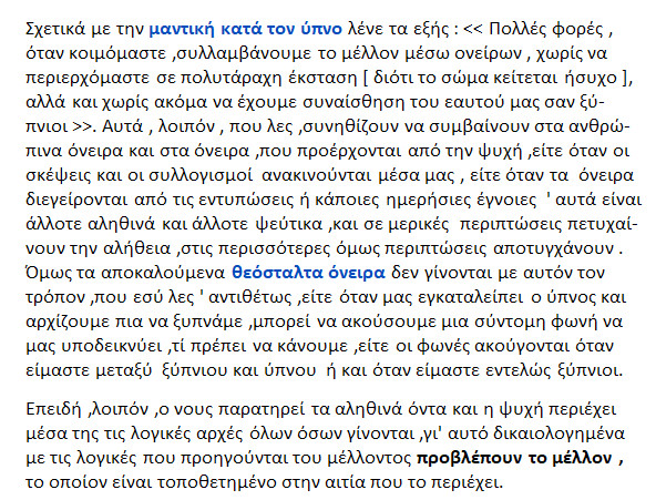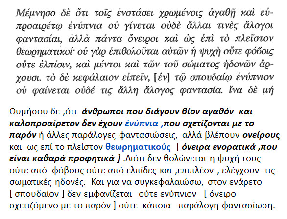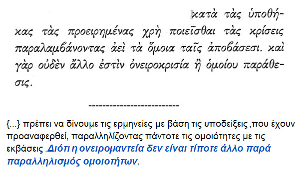<< Αναγκαίως λοιπόν τα ενύπνια είναι ή αίτια ή σημεία των γινομένων ή συμπτώματα ,και ή πάντα είναι τοιαύτα, ή τινά εξ αυτών ή εν μόνον….διὸ τῶν συμπτωμάτων οὐδὲν οὔτε ἀεὶ γίνεται͵ οὔθ΄ ὡς ἐπὶ τὸ πολύ >>.