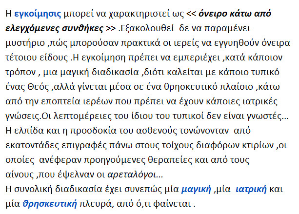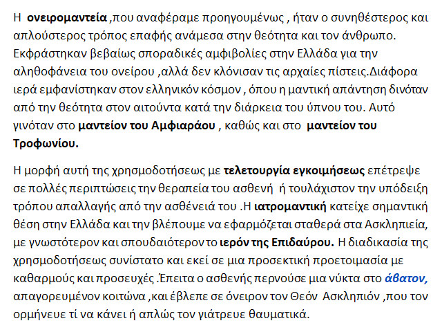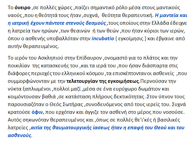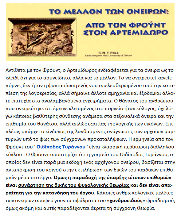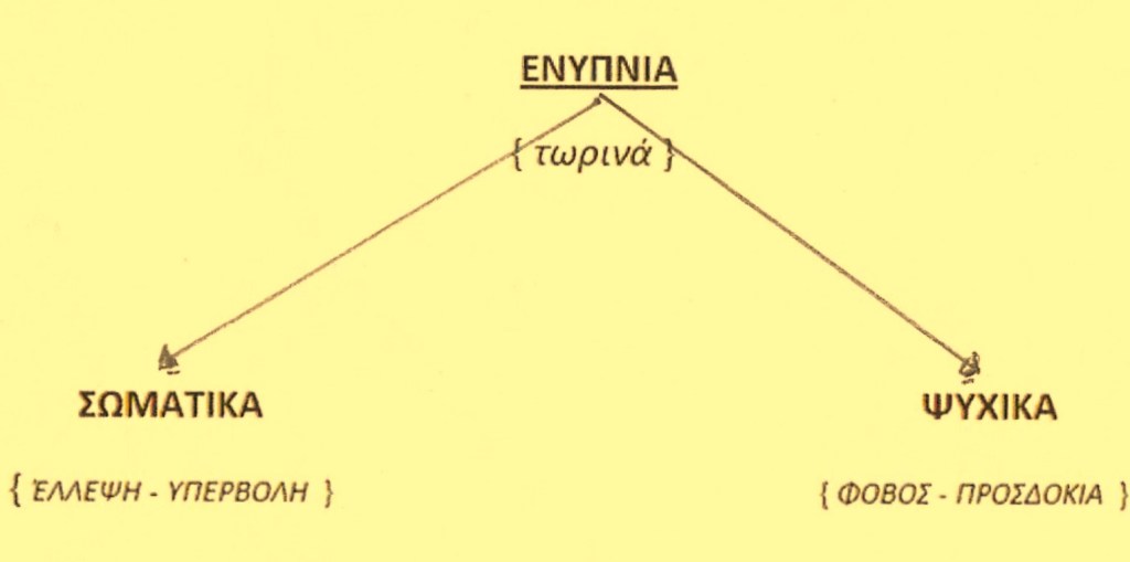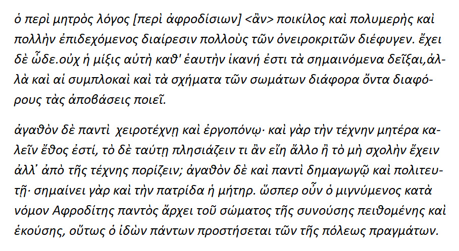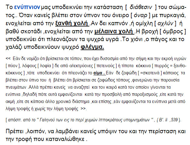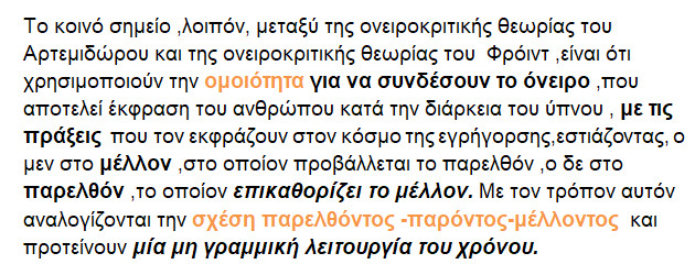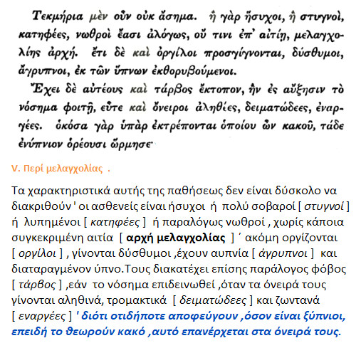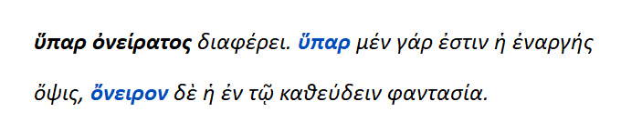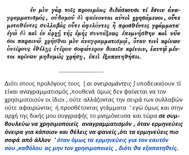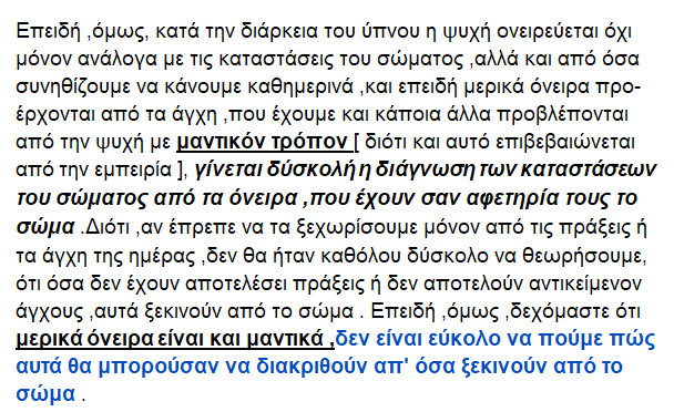 << Αναγκαίως λοιπόν τα ενύπνια είναι ή αίτια ή σημεία των γινομένων ή συμπτώματα ,και ή πάντα είναι τοιαύτα, ή τινά εξ αυτών ή εν μόνον….διὸ τῶν συμπτωμάτων οὐδὲν οὔτε ἀεὶ γίνεται͵ οὔθ΄ ὡς ἐπὶ τὸ πολύ >>.