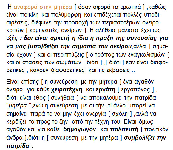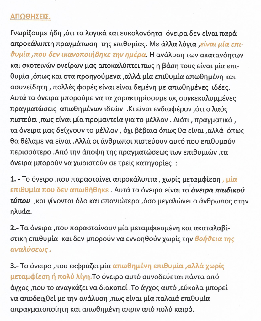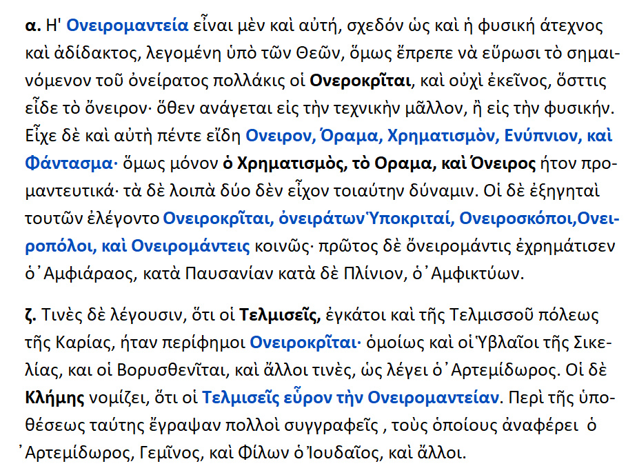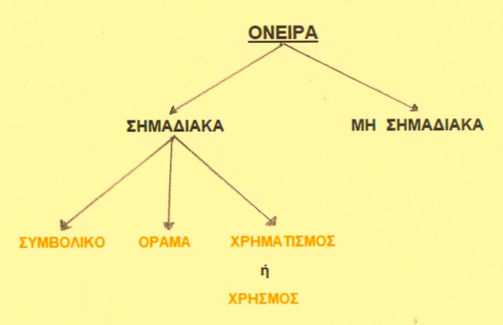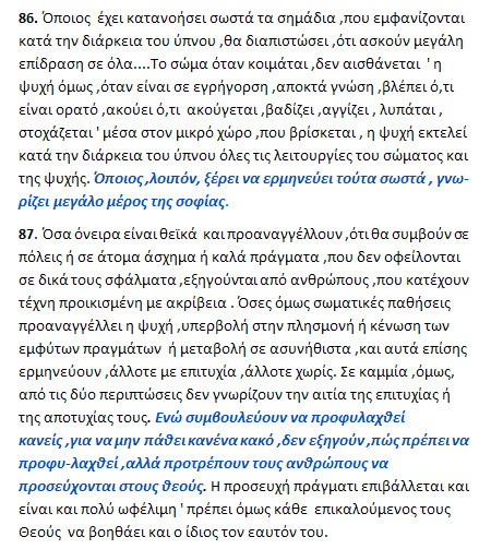 γ }. Τα ενύπνια είναι ή σημεία σωματικών και ψυχικών διαθέσεων, ή αποτελέσματα πράξεων γενομένων κατά τον καθημερινόν βίον και αίτια άλλων πράξεων, ή τυχαίες συμπτώσεις.