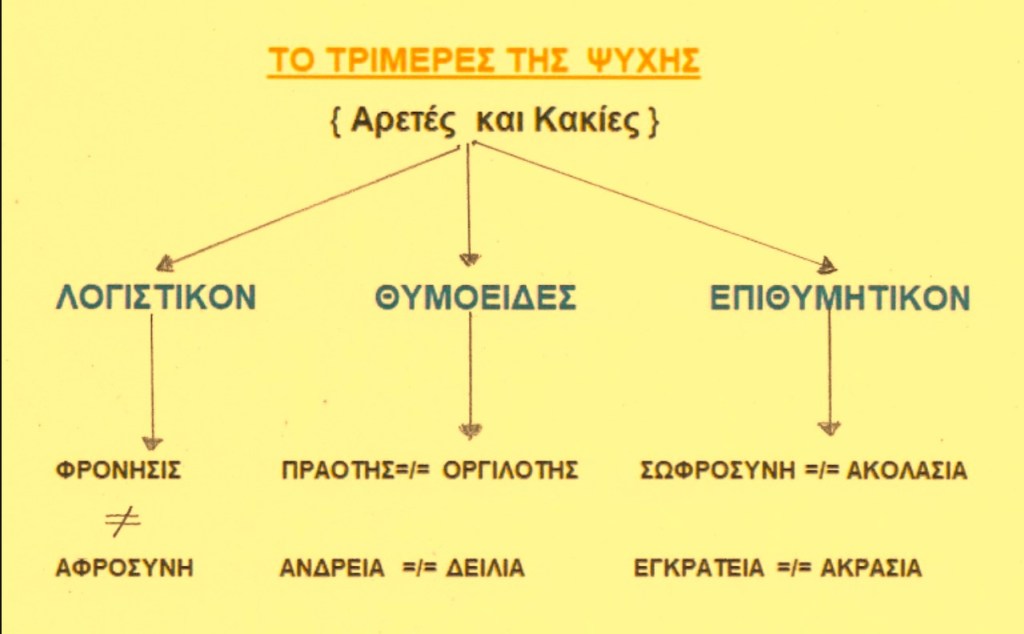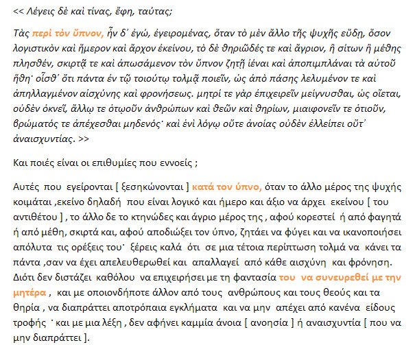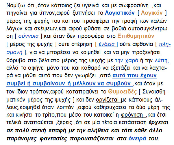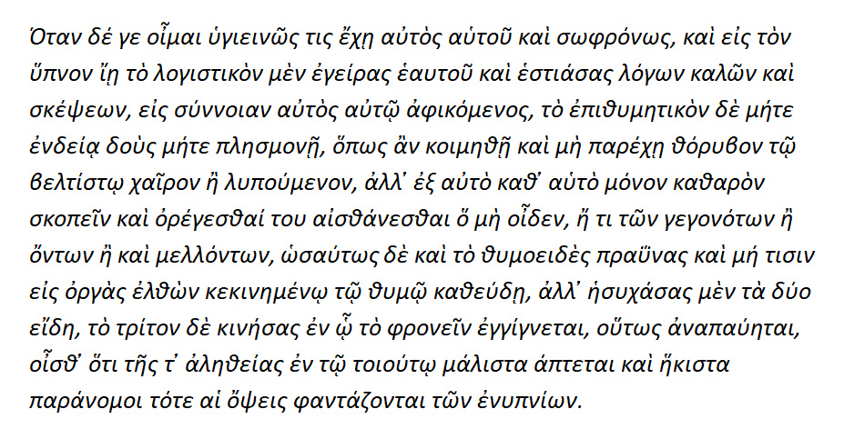 Σύμφωνα με τον τριμερή διαχωρισμό της ψυχής αρμόζει να ηρεμούν τα δύο μέρη [ Επιθυμητικόν -Θυμοειδές ] και να κυβερνά το τρίτο μέρος της ψυχής [ Λογιστικόν ] εάν θέλει κάποιος να παρουσιάζεται η αλήθεια και το κάλος στα όνειρά του και να αποφεύγει τους εφιάλτες.