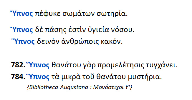 Περί ύπνου : ο ύπνος είναι η σωτηρία των σωμάτων – ο ύπνος είναι η υγιεία [ φάρμακο ] κάθε νόσου – ο ύπνος είναι φοβερόν κακό για τους ανθρώπους – ο ύπνος τυγχάνει να είναι μια προμελέτη του θανάτου – ο ύπνος είναι τα μικρά μυστήρια του θανάτου.