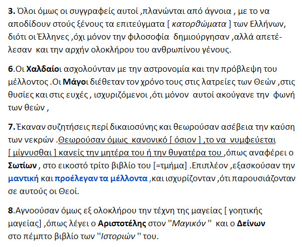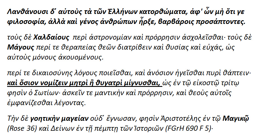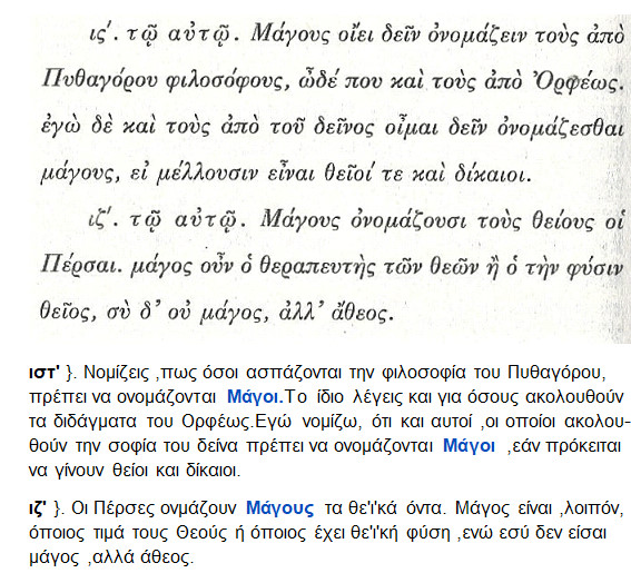 Όλοι ,όμως, οι συγγραφείς αυτοί ,πλανώνται από άγνοια , με το να αποδίδουν στους ξένους τα επιτεύγματα [ κατορθώματα ] των Ελλήνων. . .Οι Μάγοι και οι Χαλδαίοι εξασκούσαν την μαντική και προέλεγαν τα μέλλοντα ,και ισχυρίζονταν ,ότι παρουσιάζονταν σε αυτούς οι Θεοί ,αλλ’ όμως αγνοούσαν εξ ολοκλήρου την τέχνη της μαγείας [ γοητικής μαγείας ] .