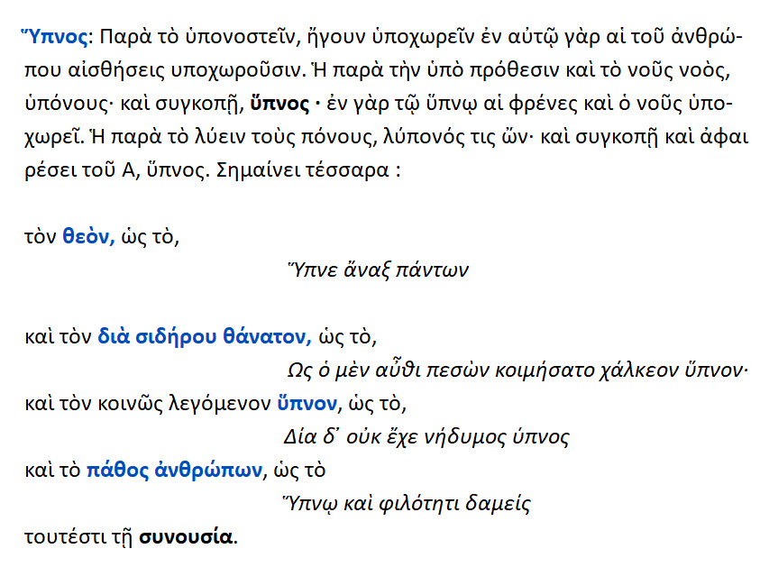 Ύπνος : α } . από το υπονοστέω-ώ ,δηλαδή υποχωρώ [ υποστρέφω ]. Διότι σ’ αυτόν [ τον ύπνο ] οι αισθήσεις του ανθρώπου υποχωρούν β }. από το » υπό + νους [ νοός ] » = υπόνοος => ύπνος [ μετά από συγκοπή ]. Διότι στον ύπνο και το συναίσθημα και η λογική υποχωρούν γ }. από το » λύω τους πόνους » , όταν κάποιος είναι λύπονος ,και μετά από συγκοπή και αφαίρεση του [ λ ] γίνεται ύπνος. Ό ύπνος έχει τέσσερες σημασίες .Σημαίνει 1. τον Θεόν .2. τον δια σιδήρου θάνατον [ χάλκεος ύπνος ] 3. ο κοινός ύπνος 4. το πάθος των ανθρώπων [ συνουσία ].