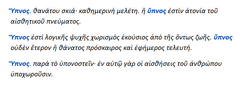 Ύπνος : 1. η σκιά του θανάτου [ σ.σ. καθότι δίδυμοι Ύπνος και Θάνατος ] 2. καθημερινή μελέτη [ = επιμέλεια, φροντίδα ] 3. ύπνος είναι η ατονία [ χαλάρωση ,αδυναμία ] του αισθητικού πνεύματος [ =των αισθήσεων ]. Ύπνος είναι ο ηθελημένος χωρισμός της Λογικής ψυχής [ σ.σ. η ‘ τριμερής’ ψυχή έχει άλλα δύο μέρη : το Θυμικόν και το Επιθυμητικόν } από την πραγματική ζωή .Ο ύπνος δεν είναι τίποτα άλλο παρά πρόσκαιρος θάνατος και εφήμερη [ βραχυχρόνια, πρόσκαιρη ] τελευτή [< τέλος ]. Ύπνος ,από το υπονοστέω-ώ { < υπό +νέομαι = υποστρέφομαι ,υποχωρώ } ,διότι στον ύπνον οι αισθήσεις του ανθρώπου υποχωρούν.