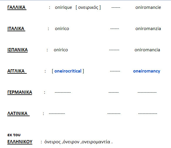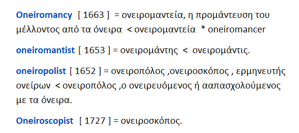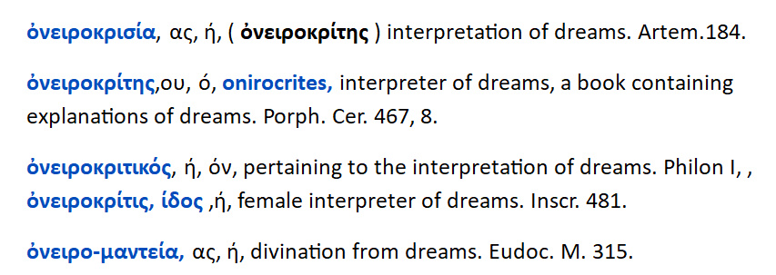 Ονειροκρισία = η ερμηνεία των ονείρων .Ονειροκρίτης [ onirocrites ] =ο ερμηνευτής των ονείρων. Ονειροκριτικός = ο σχετιζόμενος με την ερμηνεία των ονείρων . Ονειροκρίτις = η ερμηνευτής των ονείρων . Ονειρομαντεία = η εξ ονείρων μαντεία .