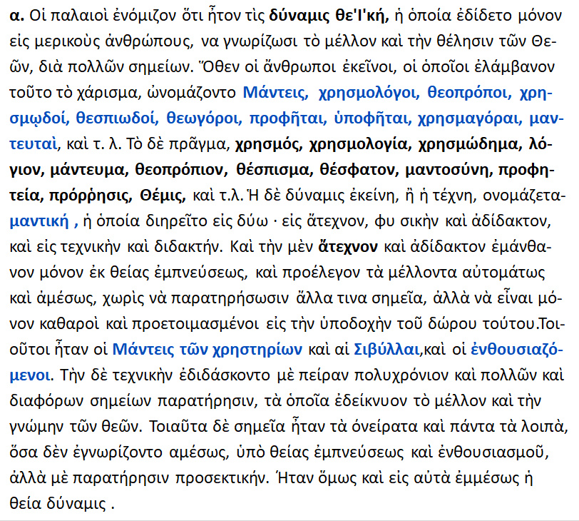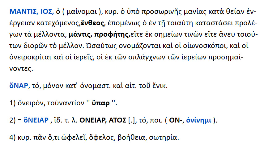 Mάντις { < μαίνομαι } : [ κυρίως ] αυτός που κατέχεται από προσωρινή μανία εξαιτίας θείας ενέργειας , ένθεος , επομένως αυτός που βρίσκεται σε τέτοια κατάσταση και προλέγει τα μέλλοντα ,μάντις ,προφήτης , αυτός που προβλέπει το μέλλον είτε από κάποια σημεία [ σήματα ] είτε χωρίς αυτά .Έτσι ονομάζονταν οι οιωνοσκόποι ,οι ονειροκρίτες ,οι ιερείς , οι σπλαγχνοσκόποι .Όναρ : 1. όνειρο [ αντιθ. ύπαρ ] 2. όνειαρ { < ονίνημι = ωφελώ }.