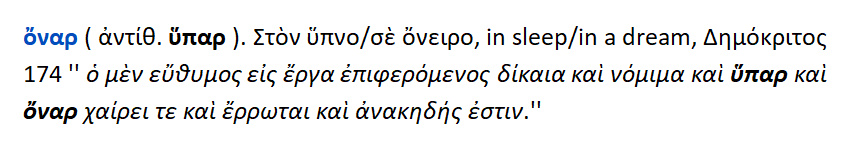 Όναρ [ όνειρος , όνειρον ] το καθ’ ύπνους όραμα ,το όνειρο που βλέπει κάποιος κατά τον ύπνον του, το ενύπνιον. Σε αντίθεση με το Ύπαρ, όραμα που βλέπει κάποιος σε εγρήγορση [=το να είναι κάποιος άγρυπνος, το να μην κοιμάται].