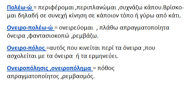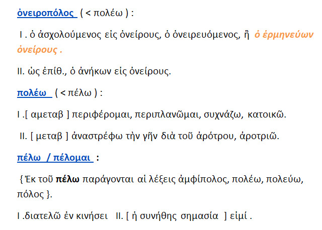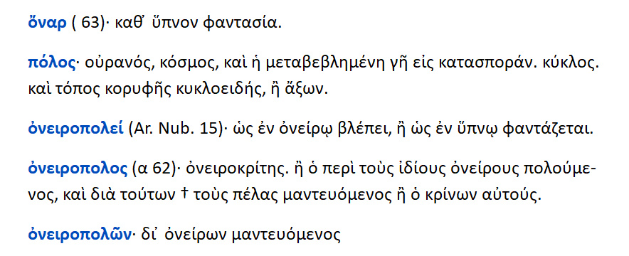 Όναρ = η φαντασία [ φαντάσματα ] κατά την διάρκεια του ύπνου . Πόλος = 1.ουρανός , κόσμος ,και η γη που έχει μεταβληθεί σε κατασπορά [ κατασπείρω =ρίχνω τον σπόρο μέσα στην γη ] 2. κύκλος 3. τόπος κορυφής κυκλικού σχήματος , ή άξονας. Ονειροπολεί =αυτός που βλέπει πράγματα σαν σε όνειρο [ ονειρεύεται ] ,η αυτός που φαντάζεται πράγματα ,όπως όταν κοιμάται [ φαντασιοκοπεί ]. Ονειροπόλος = ο ονειροκρίτης [ ερμηνευτής ονείρων ] ,ή αυτός που ερμηνεύει τα δικά του όνειρα ,και δια μέσου αυτών δίνει χρησμούς στους πλησίον του ή αυτός που κρίνει [ερμηνεύει ] τα όνειρα άλλων . Ονειροπολών = αυτός που προφητεύει δια μέσου των ονείρων.
