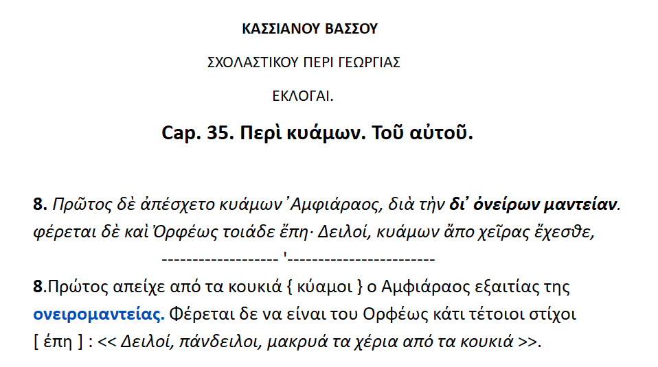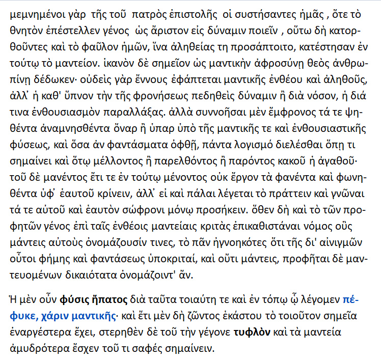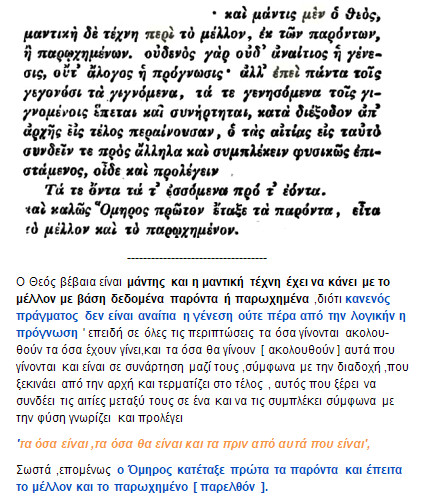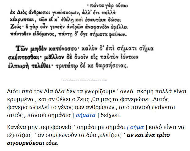 << ὅλως γὰρ οὐ πᾶν γίνεται τὸ μελλῆσαν͵ οὐδὲ τὸ αὐτὸ τὸ ἐσόμενον καὶ τὸ μέλλον· ἀλλ΄ ὅμως ἀρχάς γέ τινας λεκτέον εἶναι ἀφ΄ ὧν οὐκ ἐπετελέσθη͵ καὶ σημεῖα πέφυκε ταῦτά τινων οὐ γενομένων >>.