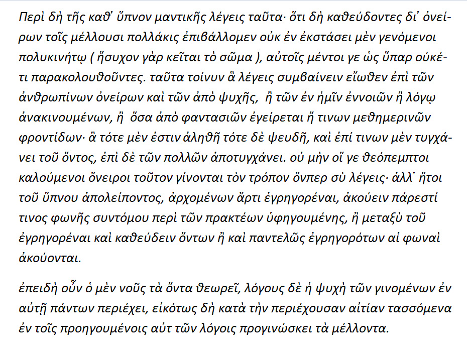 << τὸ μὲν γὰρ πάντας ἢ πολλοὺς ὑπολαμβάνειν ἔχειν τι σημειῶδες τὰ ἐνύπνια παρέχεται πίστιν ὡς ἐξ ἐμπειρίας λεγόμενον͵ καὶ τὸ περὶ ἐνίων εἶναι τὴν μαντικὴν ἐν τοῖς ἐνυπνίοις οὐκ ἄπιστον· ἔχει γάρ τινα λόγον· διὸ καὶ περὶ τῶν ἄλλων ἐνυπνίων ὁμοίως ἄν τις οἰηθείη. τὸ δὲ μηδεμίαν αἰτίαν εὔλογον ὁρᾶν καθ΄ ἣν ἂν γίνοιτο͵ τοῦτο δὴ ἀπιστεῖν ποιεῖ· τό τε γὰρ θεὸν εἶναι τὸν πέμποντα͵ πρὸς τῇ ἄλλῃ ἀλογίᾳ͵ καὶ τὸ μὴ τοῖς βελτίστοις καὶ φρονιμωτάτοις ἀλλὰ τοῖς τυχοῦσι πέμπειν ἄτοπον.ἀφαιρεθείσης δὲ τῆς ἀπὸ τοῦ θεοῦ αἰτίας οὐδεμία τῶν ἄλλων εὔλογος εἶναι φαίνεται αἰτία ‘ >>.