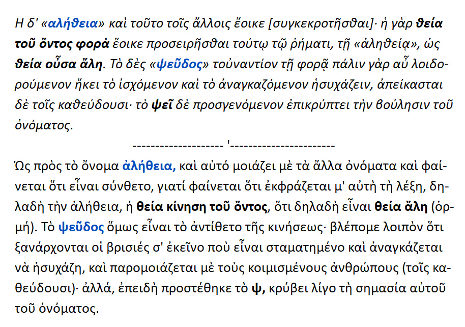 Αλήθεια { θεία + άλη = περιφορά ] .Ψεύδος = Ψ [ υχή ] + ΕΥΔΩ {= καθεύδω = κοιμάμαι ].Δηλαδή ,ψεύδος υπάρχει όταν η ψυχή κοιμάται. ,όταν βρίσκεται σε κατάσταση ύπνου ή νάρκης και δεν μπορεί να αντιδράσει ή να κρίνει [ ξεχωρίσει ] το αληθινό από το ψεύτικο. Η στάσις [ οτιδήποτε σταματάει την κίνηση ] δηλώνει κάτι κακό, μια αρνητική έννοια ,άλλωστε » τα πάντα ρει »’ ,έλεγε ο Ηράκλειτος . Ψέμα – Ψεύδος : .όταν λέει κάποιος ψέματα πρόσκαιρα μόνον καθησυχάζει το Θυμοειδές [ Συναισθηματικόν ] του , διότι ο εφησυχασμός αυτός είναι μόνον προσωρινός ,όπως ακριβώς είναι η ψυχή όταν πέφτει σε ύπνο .