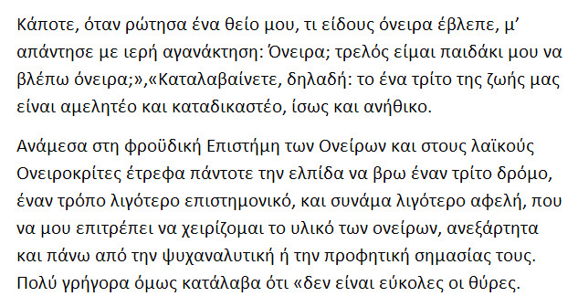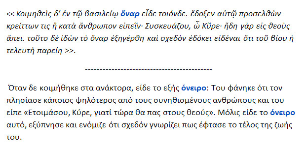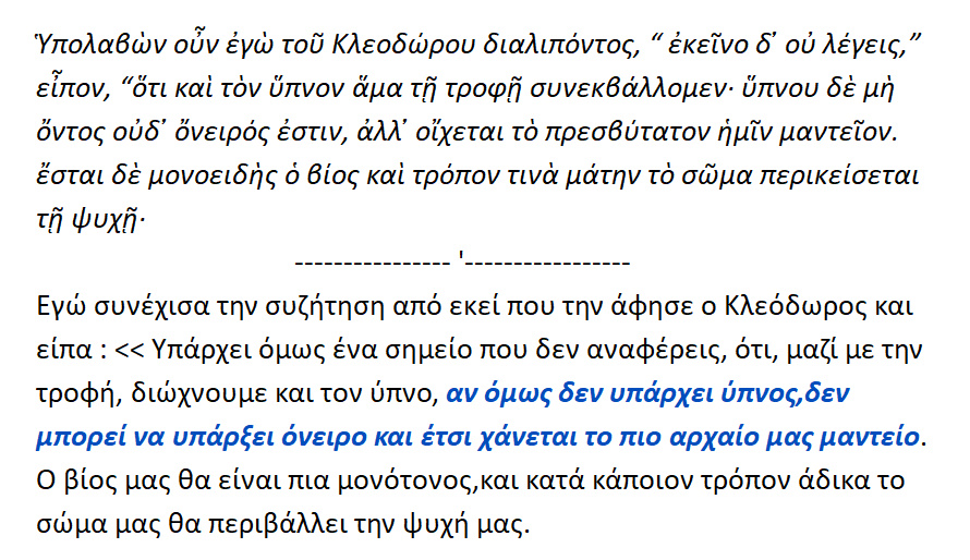<< Περὶ δὲ τῆς μαντικῆς τῆς ἐν τοῖς ὕπνοις γινομένης καὶ λεγομένης συμβαίνειν ἀπὸ τῶν ἐνυπνίων͵ οὔτε καταφρονῆσαι ῥᾴδιον οὔτε πεισθῆναι >>.