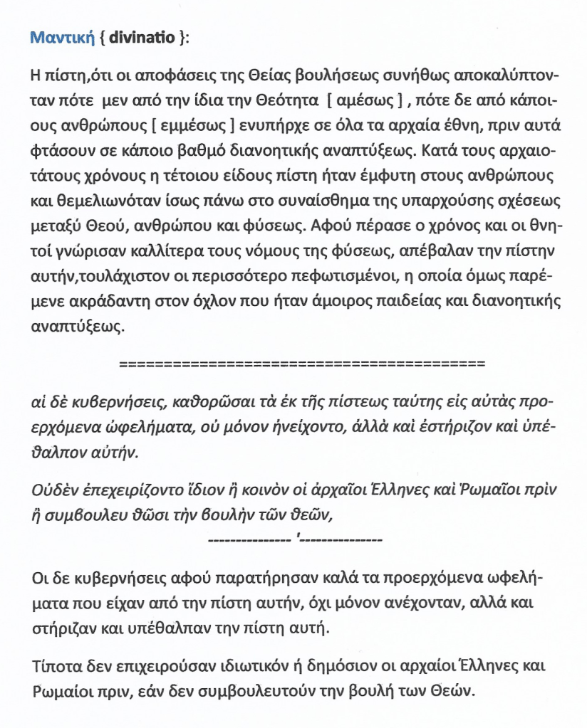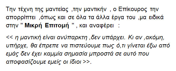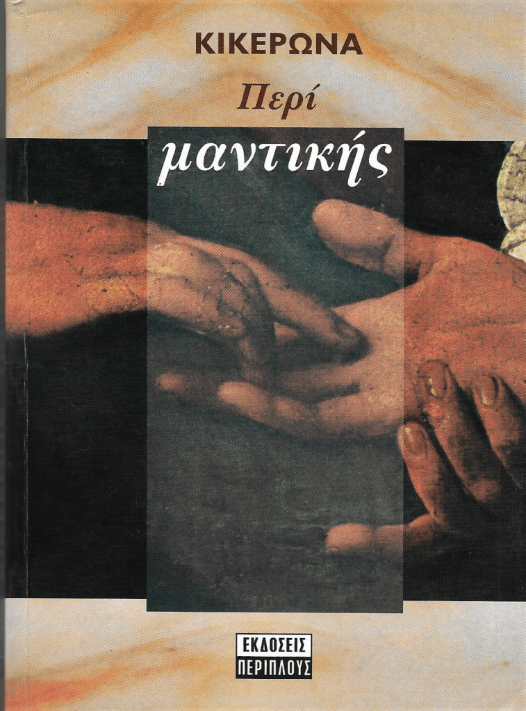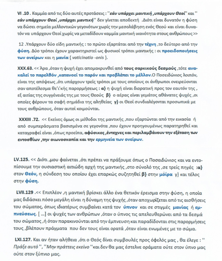 << Αγαπητέ μου Κό’ι’ντε >> ,είπα , << υπερασπίζεσαι το σημαντικότερο προπύργιον των Στω’ι’κών υπερασπί-ζοντας την αλληλεξάρτηση των δύο αυτών προτάσεων : »εάν υπάρχει μαντική ,υπάρχουν Θεοί» και » εάν υπάρχουν Θεοί ,υπάρχει μαντική». Καμμία όμως από τις δύο δεν γίνεται αποδεκτή τόσο εύκολα όσο νομίζεις . Διότι είναι δυνατόν η φύση να δώσει σημεία μελλοντικών γεγονότων χωρίς την μεσολάβηση ενός Θεού και είναι δυνατόν να υπάρχουν Θεοί χωρίς να μεταδίδουν καμμία μαντική ικανότητα στους ανθρώπους . . . Και αν ήταν αλήθεια ,ότι ο Θεός δίνει συμβουλές προς όφελός μας , θα έλεγε : » Πράξε αυτό », »Μην πράττεις εκείνο »και δεν θα μας έστελνε οράματα ούτε στον ύπνο μας ούτε στον ξύπνιο μας.