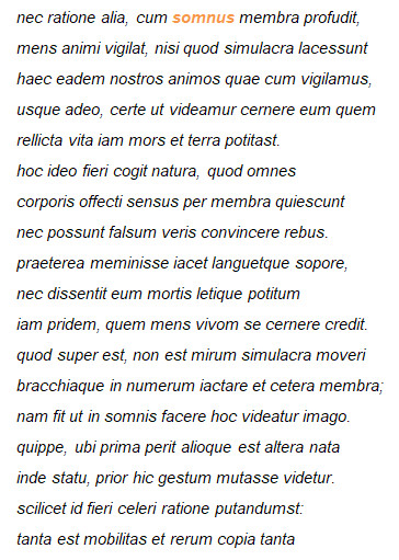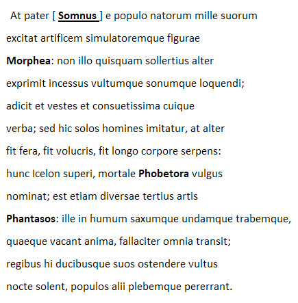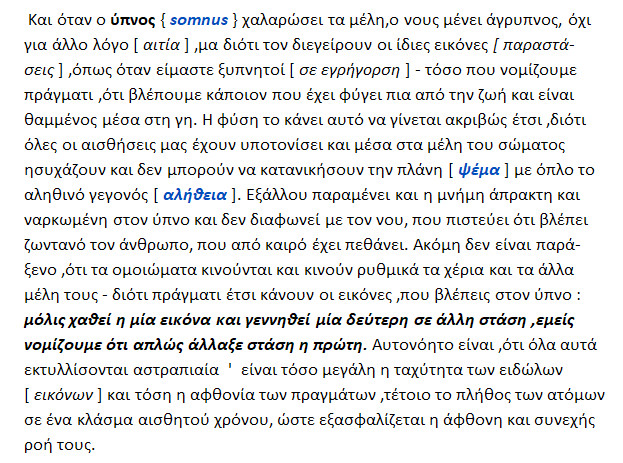 Και όταν ο ύπνος { somnus } χαλαρώσει τα μέλη ,ο νους μένει άγρυπνος, όχι για άλλο λόγο ,μα διότι τον διεγείρουν οι ίδιες παραστάσεις ,όπως όταν είμαστε ξυπνητοί – τόσο που νομίζουμε πράγματι ,ότι βλέπουμε κάποιον που έχει φύγει πια από την ζωή και είναι θαμμένος μέσα στη γη.