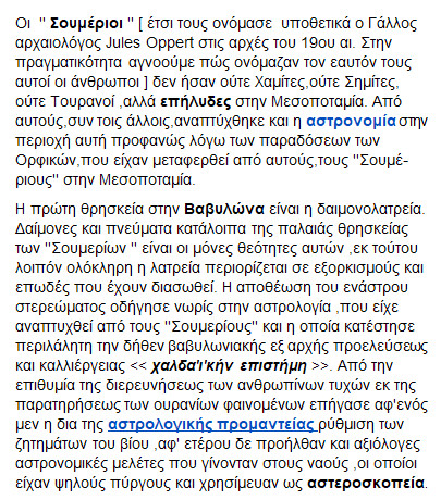 Οι » Σουμέριοι » [ έτσι τους ονόμασε υποθετικά ο Γάλλος αρχαιολόγος Jules Oppert στις αρχές του 19ου αι. Στην πραγματικότητα αγνοούμε πώς ονόμαζαν τον εαυτόν τους αυτοί οι άνθρωποι ] δεν ήσαν ούτε Χαμίτες, ούτε Σημίτες, ούτε Τουρανοί ,αλλά επήλυδες στην Μεσοποταμία. Από αυτούς, συν τοις άλλοις, αναπτύχθηκε και η αστρονομία στην περιοχή αυτή προφανώς λόγω των παραδόσεων των Ορφικών, που είχαν μεταφερθεί από αυτούς, τους »Σουμέριους», στην Μεσοποταμία.