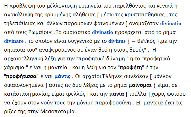 Η αρχαιοελληνική λέξη για την »προφητική δύναμη » ή το »προφητικό χάρισμα » είναι η μαντεία , και η λέξη για τον »προφήτη» ή την »προφήτισσα» είναι μάντις . Οι αρχαίοι Έλληνες συνέδεαν αυτές τις δύο λέξεις με το ρήμα μαίνομαι { είμαι σε κατάσταση μανίας, είμαι τρελλός ] και την μανία [ τρέλλα ] χωρίς ωστόσο να έχουν στον νούν τους την μόνιμη παραφροσύνη .H μαντεία έχει τις ρίζες της στην Μεσοποταμία.
