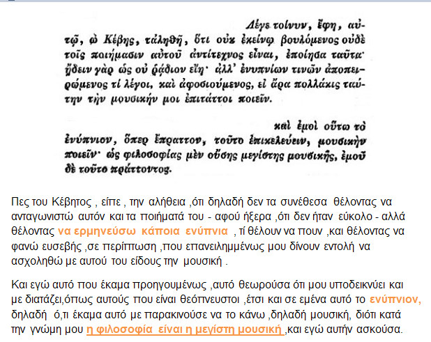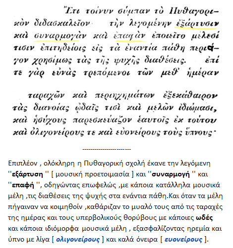 Και όταν τα μέλη της Πυθαγορικής σχολής πήγαιναν να κοιμηθούν ,καθάριζαν το μυαλό τους με κάποιες ωδές και κάποια μουσικά μέλη ,εξασφαλίζοντας ηρεμία και ύπνο με λίγα [ ολιγονείρους ] και καλά όνειρα [ ευονείρους ].