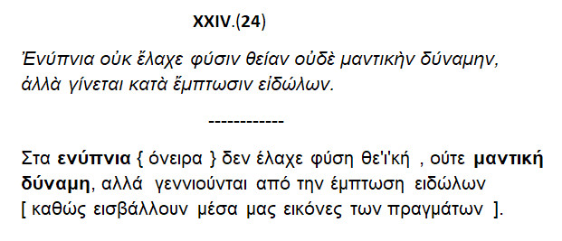 Για τα δε ενύπνια , που δεν έχουν τέτοιες αρχές ,όπως αυτές που είπαμε ήδη, αλλά αρχές οι οποίες υπερβαίνουν τα (συνήθη) όρια είτε του χρόνου είτε του τόπου είτε του μεγέθους , είτε και κανένα από αυτά , χωρίς όμως αυτοί που είδαν το όνειρο να έχουν μέσα τους τις αρχές του ,γι’ αυτά πρέπει να πούμε, ότι εάν η πρόβλεψη δεν είναι απλή σύμπτωση, η επομένη εξήγηση είναι πιο εύλογη από αυτήν του Δημοκρίτου, ό οποίος αποδίδει την αιτία σε εικόνας [ απεικονίσεις ] και απορροές [ εκπομπές ]των πραγμάτων. [ από εκείνα τα αντικείμενα , εκ των οποίων ο Δημόκριτος λέγει ότι εκπέμπονται είδωλα και απορροές ].