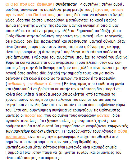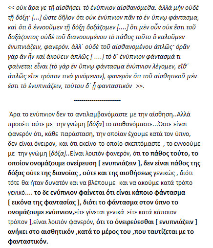 << αὗται δ΄ αἱ κινήσεις φαντάσματα ποιοῦσιν͵ ἐξ ὧν προορῶσι τὰ μέλλοντα καὶ περὶ τῶν τοιούτων͵καὶ διὰ ταῦτα συμβαίνει τὸ πάθος τοῦτο τοῖς τυχοῦσι καὶ οὐ τοῖς φρονιμωτάτοις. μεθ΄ ἡμέραν τε γὰρ ἐγίνετ΄ ἂν καὶ τοῖς σοφοῖς͵ εἰ θεὸς ἦν ὁ πέμπων· οὕτω δ΄ εἰκὸς τοὺς τυχόντας προορᾶν· ἡ γὰρ διάνοια τῶν τοιούτων οὐ φροντιστική͵ ἀλλ΄ ὥσπερ ἔρημος καὶ κενὴ πάντων͵ >>.