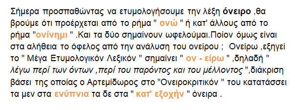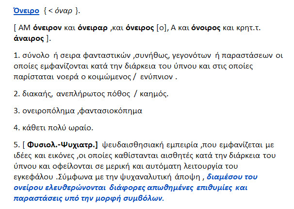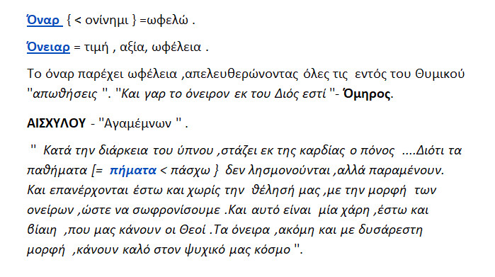 Όναρ { < ονίνημι } = ωφελώ . Όνειαρ = τιμή , αξία, ωφέλεια . Το όναρ παρέχει ωφέλεια ,απελευθερώνοντας όλες τις εντός του Θυμικού »απωθήσεις ».