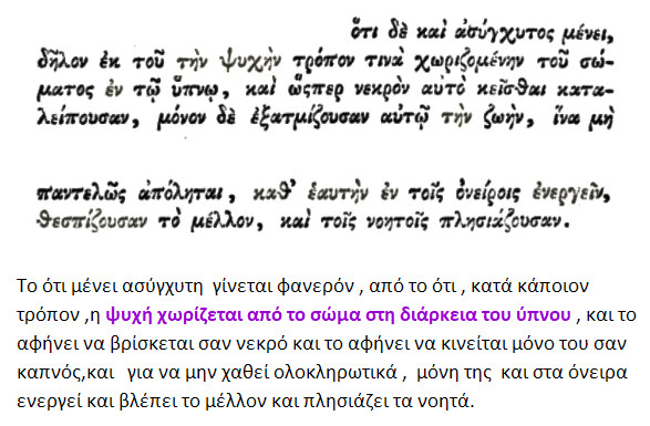 Δεν αλλοιώνεται η ψυχή κατά την ένωσή της με το σώμα { ουκ άρα αλλοιούται η ψυχή εν τη ενώσει } .Και ενώνεται ασυγχύτως [ χωρίς να συγχέεται ] η ψυχή με το σώμα { και ήνωται τοίνυν και ασυγχύτως ήνωται τω σώματι η ψυχή }. Μένει ασύγχυτη ,επειδή η ψυχή χωρίζεται από το σώμα στη διάρκεια του ύπνου , και το αφήνει να βρίσκεται σαν νεκρό και να κινείται μόνο του σαν καπνός ,και για να μην χαθεί ολοκληρωτικά , μόνη της και στα όνειρα ενεργεί και βλέπει το μέλλον και πλησιάζει τα νοητά.
