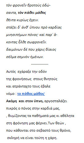 Ακόμη και στον ύπνο, αργοσταλάζει πικρός ο πόνος στην καρδιά μας, , θυμίζοντας τα παθήματά μας [ πήματα ] κι αθέλητα στη φρόνηση μας φέρνει. { σ.σ. όπως λέει και ο λαός »το πάθημα του ‘γινε μάθημα »}.