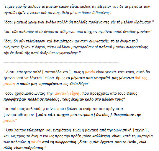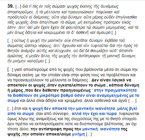 Η ψυχή δεν αποκτά την μαντική ικανότητά της ,μόλις βγει από το σώμα ,διότι την έχει και τώρα ,αλλά τυφλώνεται λόγω της αναμείξεως και της συγχύσεώς της με το θνητό στοιχείο. Αποκαλούμε μνήμη , την αντίστροφη προς την μαντική ικανότητα της ψυχής ,