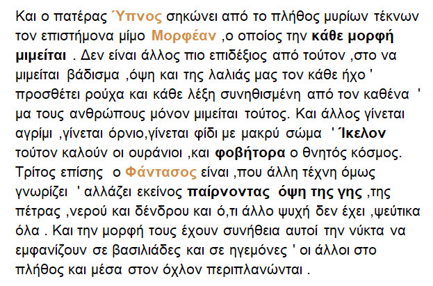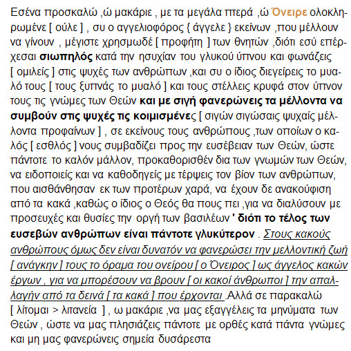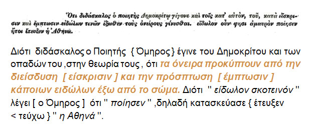 Tα όνειρα προκύπτουν από την διείσδυση [ είσκρισιν ] και την πρόσπτωση [ έμπτωσιν* ] κάποιων ειδώλων έξω από το σώμα. Διότι » είδωλον σκοτεινόν » λέγει [ ο Όμηρος ] ότι » ποίησεν » ,δηλαδή κατασκεύασε { έτευξεν < τεύχω } » η Αθηνά ‘‘.