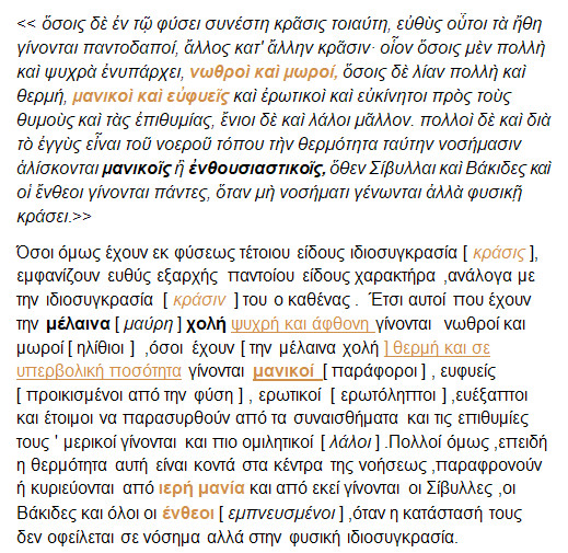 << Ὅλως δὲ ἐπεὶ καὶ τῶν ἄλλων ζῴων ὀνειρώττει τινά͵ θεόπεμπτα μὲν οὐκ ἂν εἴη τὰ ἐνύπνια͵ οὐδὲ γέγονε τούτου χάριν (δαιμόνια μέντοι· ἡ γὰρ φύσις δαιμονία͵ ἀλλ΄ οὐ θεία). σημεῖον δέ· πάνυ γὰρ εὐτελεῖς ἄνθρωποι προορατικοί εἰσι καὶ εὐθυόνειροι͵ ὡς οὐ θεοῦ πέμποντος͵ ἀλλ΄ ὅσων ὥσπερ ἂν εἰ λάλος ἡ φύσις ἐστὶ καὶ μελαγχολική͵ παντοδαπὰς ὄψεις ὁρῶσιν·διὰ γὰρ τὸ πολλὰ καὶ παντοδαπὰ κινεῖσθαι ἐπιτυγχάνουσιν ὁμοίοις θεωρήμασιν͵ ἐπιτυχεῖς ὄντες ἐν τούτοις ὥσπερ ἔνιοι ἀρτιάζοντες· ὥσπερ γὰρ καὶ λέγεται ἂν πολλὰ βάλλῃς͵ ἄλλοτ΄ ἀλλοῖον βαλεῖς͵ καὶ ἐπὶ τούτων τοῦτο συμβαίνει >>.