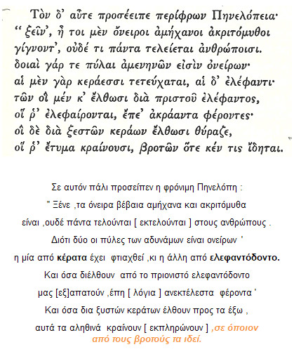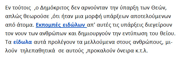 << περὶ δὲ τῶν μὴ τοιαύτας ἐχόντων ἀρχὰς ἐνυπνίων οἵας εἴπομεν͵ ἀλλ΄ ὑπερορίας ἢ τοῖς χρόνοις ἢ τοῖς τόποις ἢ τοῖς μεγέθεσιν͵ ἢ τούτων μὲν μηδέν͵ μὴ μέντοι γε ἐν αὑτοῖς ἐχόντων τὰς ἄρχας τῶν ἰδόντων τὸ ἐνύπνιον͵ εἰ μὴ γίνεται τὸ προορᾶν ἀπὸ συμπτώματος͵ τοιόνδ΄ ἂν εἴη μᾶλλον ἢ ὥσπερ λέγει Δημόκριτος εἴδωλα καὶ ἀποῤῥοίας αἰτιώμενος. . ..(ἀφ΄ ὧν ἐκεῖνος τὰ εἴδωλα ποιεῖ καὶ τὰς ἀποῤῥοίας) >>.
