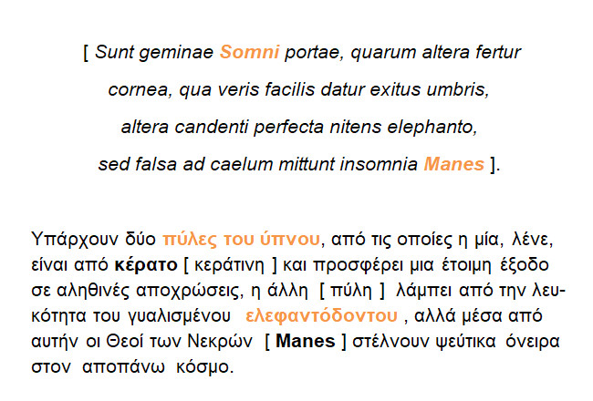 Ο Αινείας και η Κυμαία Σίβυλλα μπαίνουν από το σπήλαιο της Αόρνου Λίμνης στον Κάτω Κόσμο και μετά φεύγουν από αυτόν μέσ’ απ’ την Πύλη του Ελεφαντοστού, απ’ όπου στέλνονται στους θνητούς τα απατηλά όνειρα { falsa insomnia }.