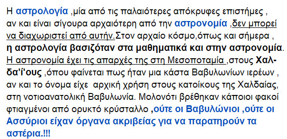 Η αστρολογία ,μία από τις παλαιότερες απόκρυφες επιστήμες ,δεν μπορεί να διαχωριστεί ,από την αστρονομία .Έχει τις απαρχές της στη Μεσοποταμία. { ; } Μολονότι βρέθηκαν κάποιοι φακοί φτιαγμένοι από ορυκτό κρύσταλλο ,ούτε οι Βαβυλώνιοι ,ούτε οι Ασσύριοι είχαν όργανα ακριβείας για να παρατηρούν τ’ αστέρια { ; } !.